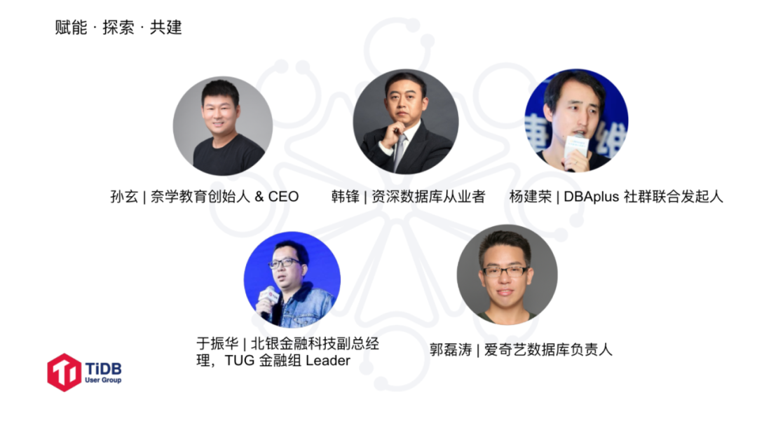 本次 TUG 共邀请了五位行业内顶级的数据架构师或系统架构师,五位老师从业背景覆盖互联网、金融、云厂商、传统行业,技能覆盖系统架构师、数据库、大数据,培训讲师、技术社区等领域,他们分别是: